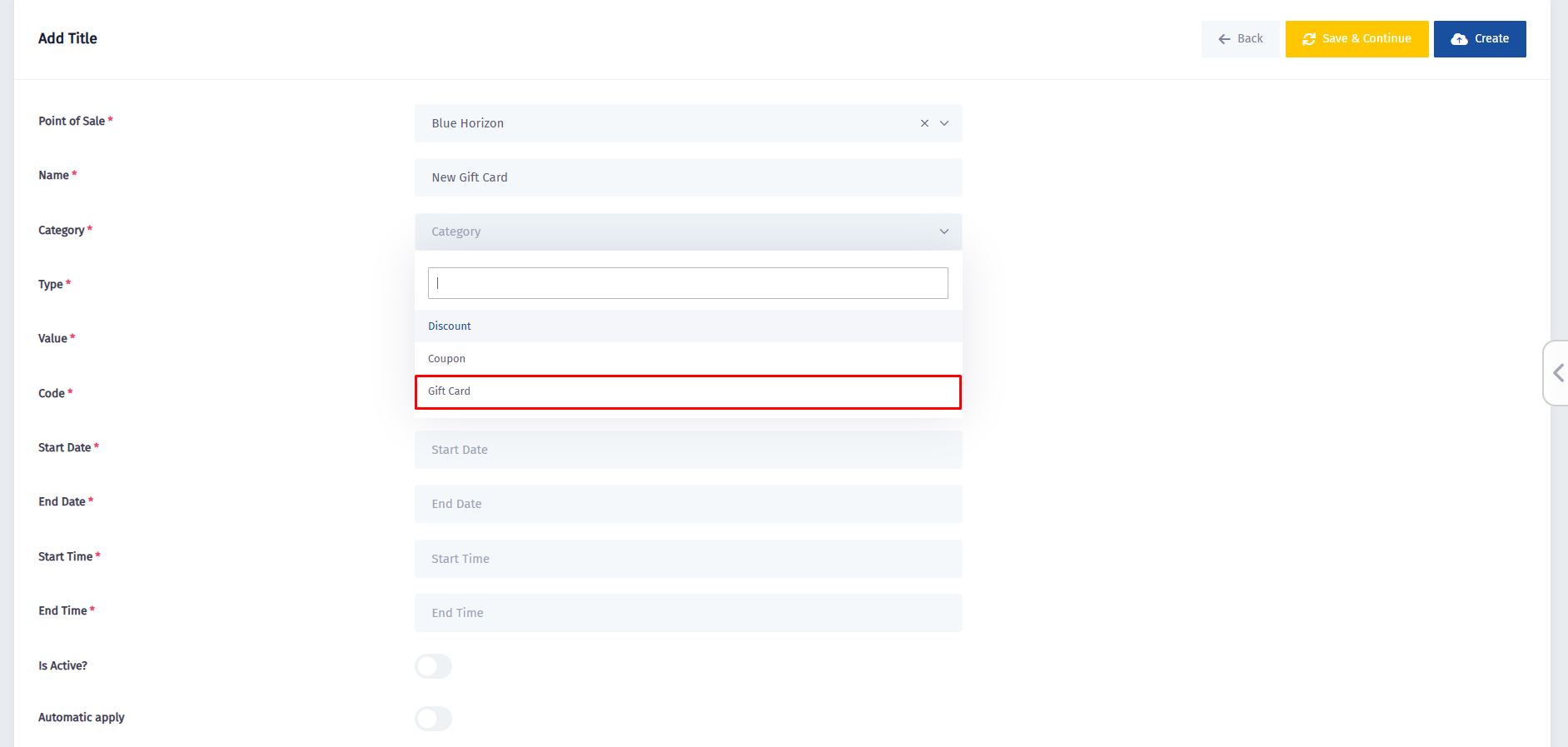 - Click on the Category field, and once the dropdown menu appears, click on Gift Card.