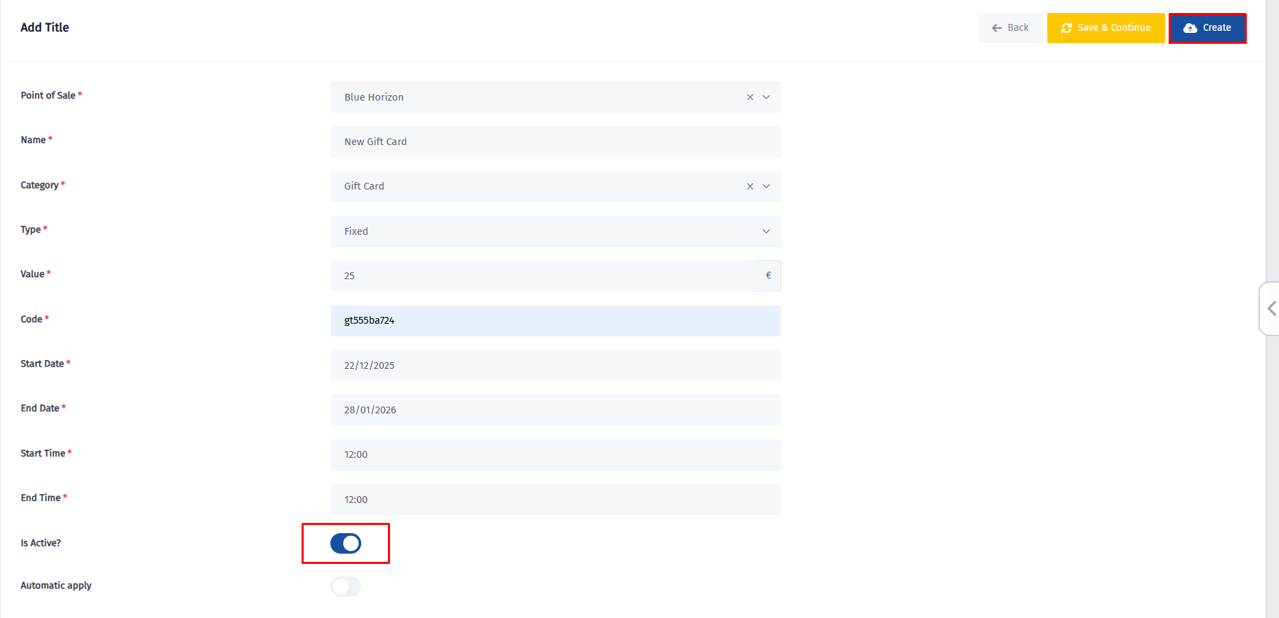 - After filling in all of the information, make sure to turn the Is Active? switch on and then click on Create.